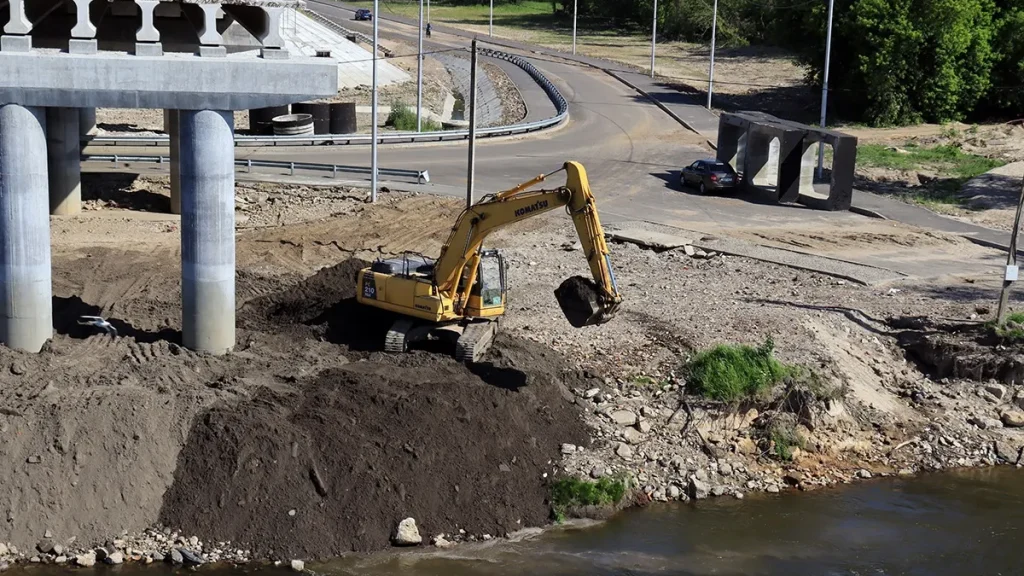 Сегодня подрядная организация ООО «Мостремстрой» уложила последнюю — 18-ю балку на седьмом пролете. На эти работы компании потребовалась одна неделя. Вес каждой балки до 35 тонн. Параллельно подрядчик занимается устройством насыпи под мостом со стороны дороги–защитной дамбы. Это необходимо для строительства последней опоры», − подчеркнули в мэрии.
