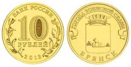 С 5 ноября Центробанк России выпустил в обращение десятирублёвые монеты, на которых изображён герб Брянска − тиражом в десять миллионов штук.