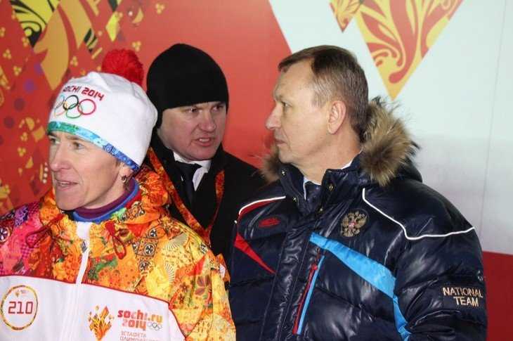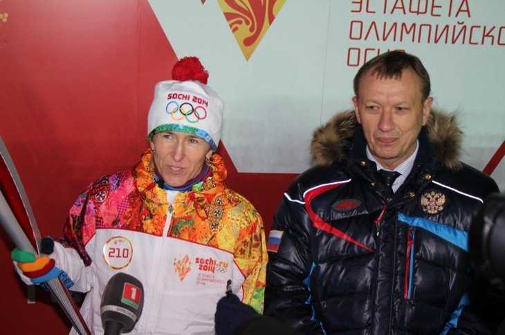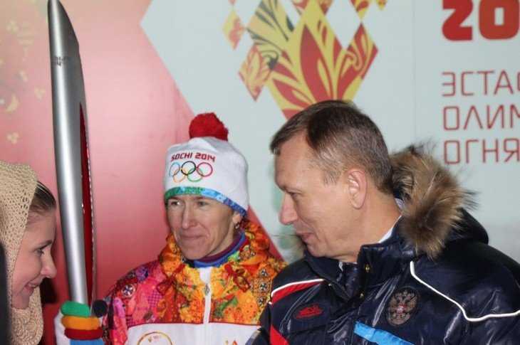 Последний этап эстафеты доверили олимпийской чемпионке Ларисе Куркиной. Вместе с ней факел к чаще поднес и губернатор Николай Денин.