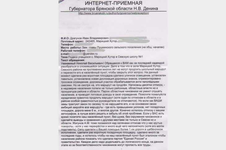 Напомним, Иван Драгунов бьется за продление маршрута школьного автобуса в селе Марицкий Хутор. Сейчас школьники вынуждены ходить далеко за пределы села. Это не просто опасно, но и влечёт нарушения норм закона, утверждает депутат. И вот поставлена точка. На бумаге, но не на деле. Иван Драгунов как депутат 17 января отправился к Жигунову на приём, который тот вёл в Севске.