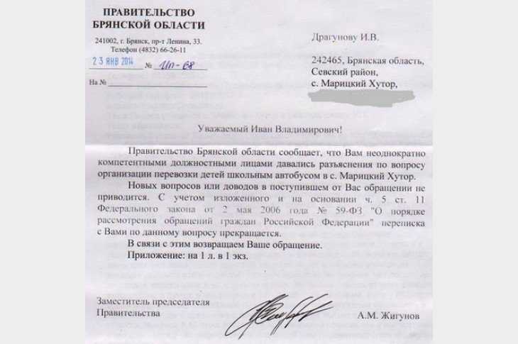 Уже сегодня, 24 января, депутат получил заказное письмо брянского правительства за подписью Александра Жигунова. Он отказывается вести с избранником народа переписку.