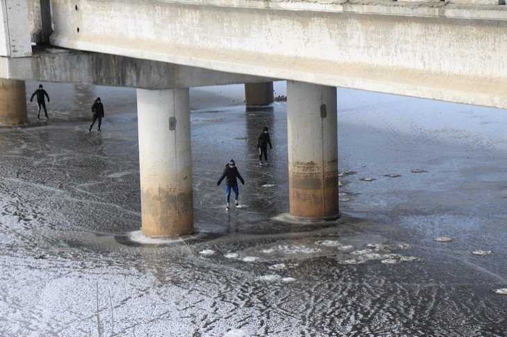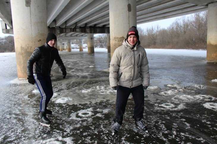 − Катаемся почти каждый день, потому что живем рядом. То, что можно утонуть, знаем, но когда опасно, на лед не выходим. Ждем, когда он окрепнет. Ориентируемся по рыбакам, но стараемся выходить позже них, потому что они люди увлеченные и иногда рискуют. Катаемся под мостом, потому что здесь лед ровнее. Он просматривается, можно оценить толщину. Тут безопасно, мы это знаем.