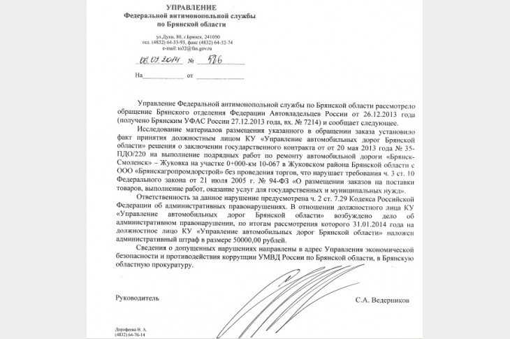 По заявлению Брянского отделения Федерации автовладельцев России управление Федеральной антимонопольной службы оштрафовало начальника областного управления дорожного хозяйства Игоря Таланова. Он наказан за нарушение законодательства при заключении контракта на ремонт дорог.