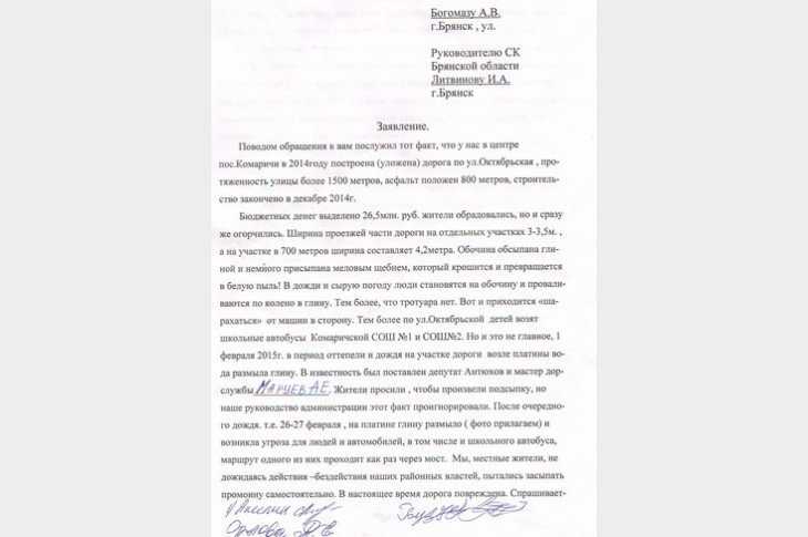 Жители брянского райцентра Комаричи отправили в Брянск заявление по поводу провала новой дороги, на которую казна затратила 26,5 миллиона рублей.