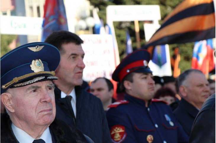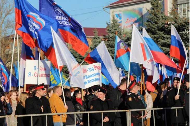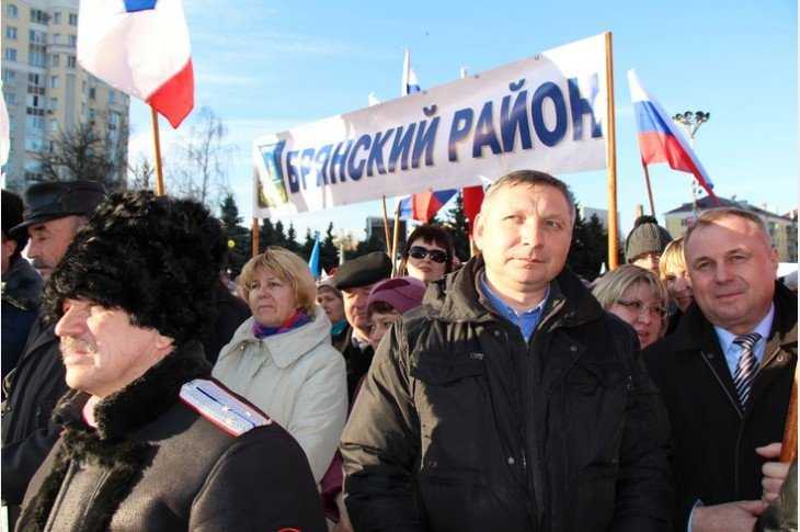Пришедших на праздничный концерт встречал большой экран с документальными теперь уже кадрами, запечатлевшими подписание исторического договора о воссоединении России и его истерзанной 23 годами украинской оккупации земли. Мелькали на экране счастливые лица крымчан, кто-то плакал, многие обнимались и целовались. Брянцы с любопытством смотрели кадры, ставшие историей. Площадь наполнялась людьми с такими же светлыми лицами, как и у крымчан год назад. Необыкновенно голубое небо с перистыми облаками повисло над Брянском. Солнечные лучи пронзали развевающиеся флаги и слепили шеренги студентов и казаков. С первыми аккордами российского гимна в воздух взмыли голуби, которые «прописаны» на крышах близлежащих домов. Так случайно-символично и красиво начался митинг-концерт в честь великого события. Гимн России звучал в исполнении ансамбля «Бабкины внуки» − его руководитель Владимир Латенков удивительно проникновенно командовал праздничным действом на площади Партизан. Поразило и то, что очень многие, и молодежь в том числе, пели гимн вместе с «Внуками».