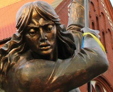 В тоже время белорусских чиновников не смущает то, что в разгул гражданской войны на Украине около здания правительства в Минске распространялись жовто–блакитные ленты. Причем одну из них символично повязали на копье, которое дежит скульптурный Архангел Михаил.