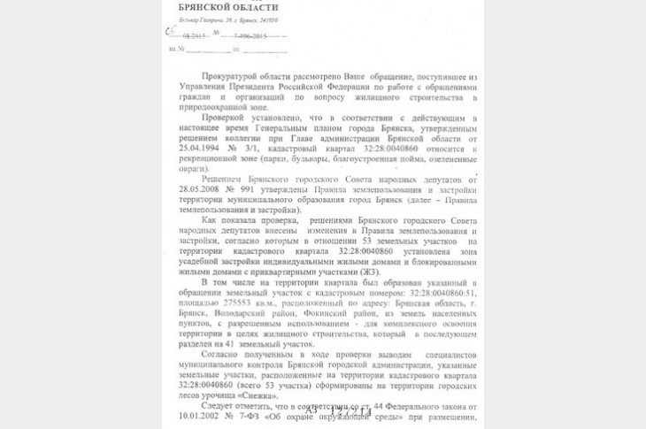 Как уже сообщили «Брянские новости», природоохранная прокуратура обратилась в суд, чтобы защитить городские леса, отданные под жилищное строительство. Уже несколько лет в судах рассматриваются дела по лесному массиву «Урочище Снежка», расположенному в Фокинском районе Брянска. Прежнее руководство управления имущественных отношений Брянской области из 40 гектаров урочища большую часть уже передало в аренду строительным дельцам. Выяснилось, что еще в 2008 году заповедные земли разрешили застраивать депутаты горсовета. И подчиненные Николая Денина из управления имущественных отношений засучили рукава.