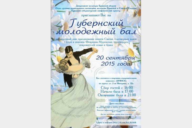 Губернский молодежный бал, посвящённый дню празднования памяти Святых благоверных князя Петра и княгини Февронии Муромских чудотворцев, покровителей семьи и брака, пройдет в Брянске.