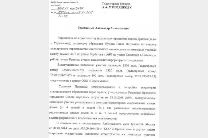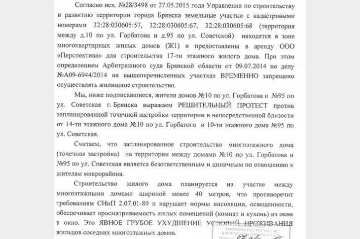 Жители микрорайона с мая 2015 года неоднократно подавали коллективные обращения брянским властям и просили создать на территории между домами сквер. Брянцы требуют расторгнуть договор аренды с ООО «Перспектива» (ООО «ПИК»). Брянская городская администрация инициативу поддержала.