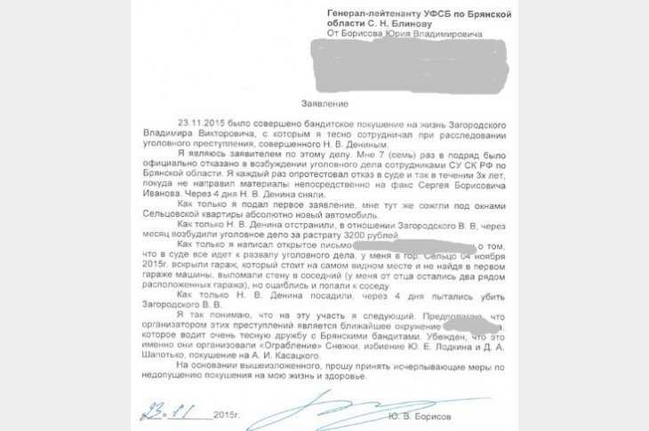 Юрий Борисов, который ранее был заместителем Николая Денина на «Снежке» и руководителем аппарата областной администрации, семь раз требовал от управления Следственного комитета возбуждения дела против бывшего губернатора и семь раз получал отказ. Уже после первого заявления неизвестные лица сожгли его новый автомобиль, что легко проверить сопоставлением дат. В своем заявлении начальнику УФСБ, которое Борисов передал и «Брянским новостям», он перечисляет не менее странные совпадения. Естественно, его встревожило и ранение Владимира Загородского, которому он передавал документы, свидетельствовавшие о преступлении Денина. «Я так понимаю, что на эту участь я следующий», – заключает Юрий Борисов.