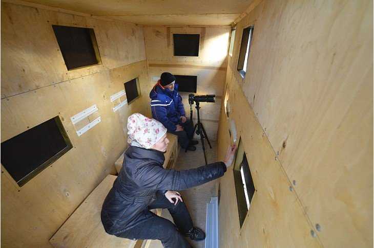 Внутреннее наполнение скрадка, при его совсем небольших размерах, даёт возможность работать в нём одновременно двум людям, к примеру оператору и редактору. Нижние окна позволяют изменить ракурс съемки и приблизится к объекту. В скрадке есть и стол, который трансформируется из кровати. На боковых сторонах скрадка сверху в углу имеются окна для вентиляции и освещения, снаружи закрытые темной сеткой от насекомых, внутри эти окна можно открывать и закрывать оргстеклом-шторкой. В общем, в нём продумано максимально много, что позволяет упростить бытовую часть работы фотографа.