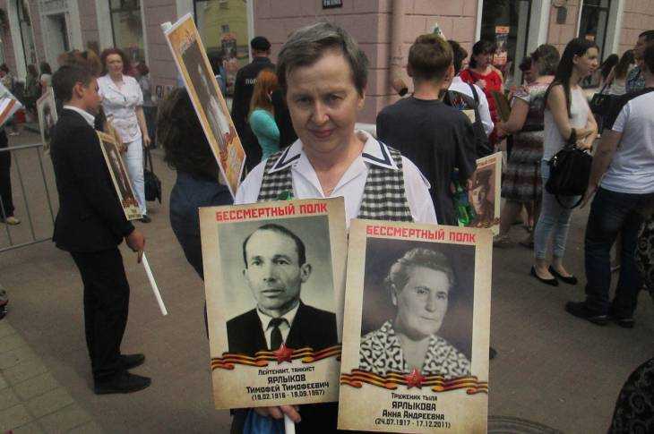 − Сегодня здесь со мной – портреты моих родителей. Мама, Анна Андреевна Ярлыкова – труженик тыла. В 1944 году приехала в Брянск, здесь работала учительницей. Очень многие помнят её уроки доброты, сострадания к ближним и любви к Родине. Она вдохновляла ребят собственным примером. Отец мой – Ярлыков Тимофей Тимофеевич летом 1941 года попросился на фронт, хотя как автомеханика военного аэродрома его защищала броня. На фронте папа был танкистом. Во время боя под Курском его танк подбили. Раненый и контуженый отец попал в плен, оказался в концлагере. После освобождения попал к белорусским партизанам, с ними дошёл до 65-й армии, а затем – до Берлина. После войны работал лаборантом в техникуме. Великий был труженик – мастер на всех руки. Воспитал троих детей. До сих пор его добрым словом вспоминают соседи, коллеги, ученики: «Добрый, отзывчивый был человек». Горжусь своими родителями. В акции «Бессмертный полк» принимаю участие уже во второй раз. Наши воины дали нам мир и свободу – только благодаря им мы живём, растим детей, делаем всё для процветания нашей любимой Родины. Эта акция необходима – она объединяет русских людей. Сейчас столько страха, беззакония, войн, а хочется мира и спокойствия для всех людей.