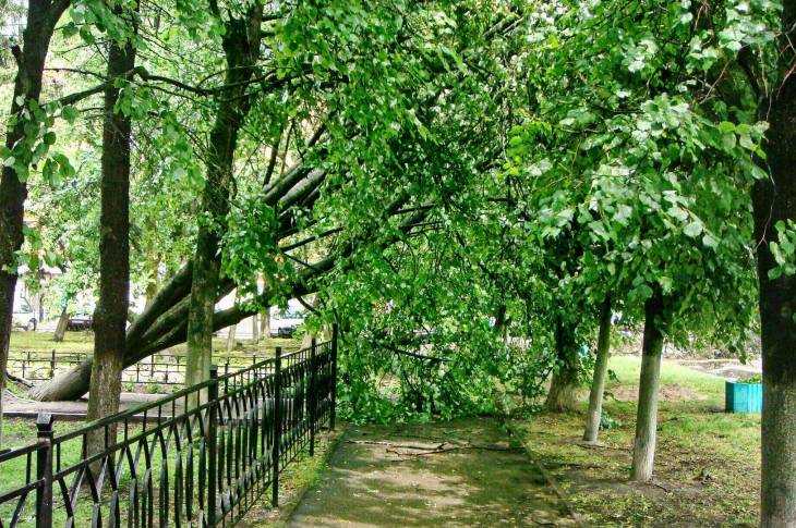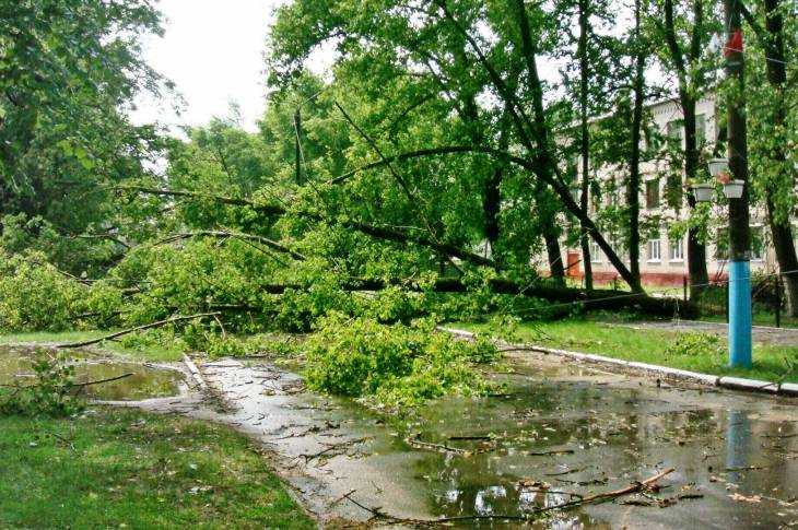 Ураган выворотил с корнем большие деревья в брянском городе Сельцо. Падая, они разрушали крыши домов, а на тротуарах образовались воронки. Улицы залило водой.