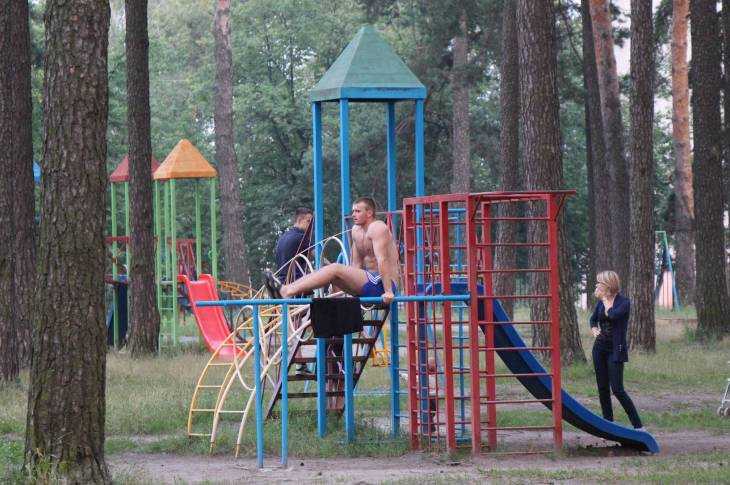 Здесь же расположена детский парк со спортивным оборудованием. Здесь юные гимнасты показывали чудеса силы и ловкости, увлекая своим умением сверстников.