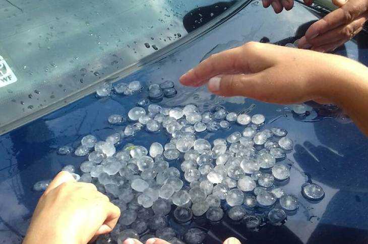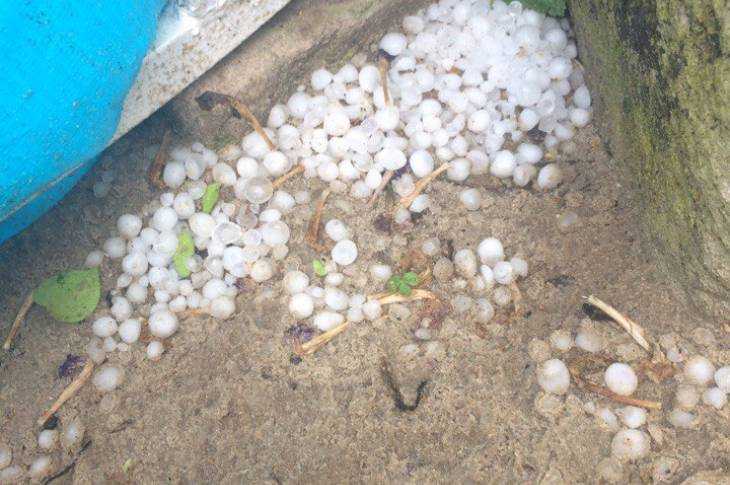 Жители города делятся в соцсетях фотографиями последствий прошедшего дождя, публикуя снимки крупного града.