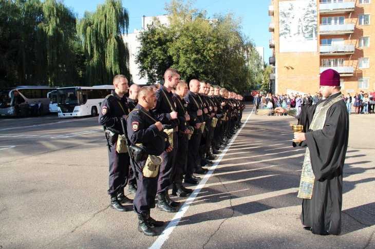 В командировку бойцов проводили родные и руководство областной полиции. Священник Михаил Агешин совершил напутственный молебен.