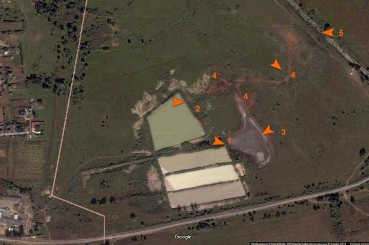 Фото: Google Карты. Обозначения на фото: 1, 2 − предположительно места возможных прорывов отстойников, 3 − предположительно новообразованное в результате прорыва озерцо со стоками, 4 − русло движения стоков по направлению к реке (русло оформилось, возможно, прорыв не первый), 5 − русло реки Сев.