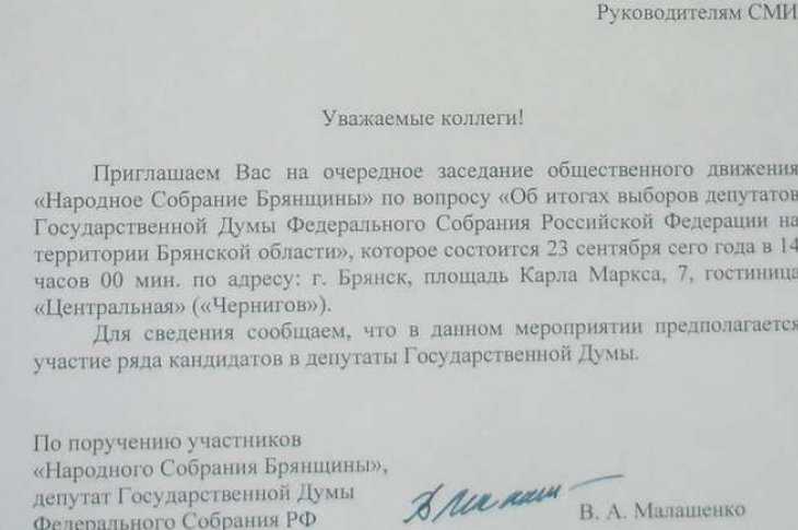 Накануне редакторам изданий, хотя и не всем, на своем бланке разослал приглашения бывший сотрудник КГБ и уходящий депутат Государственной Думы Виктор Малашенко. Пришли коммунист Александр Куприянов, бывший руководитель партийной ячейки ЛДПР Михаил Марченко, депутат областной думы Иван Медведь, предприниматель Александр Коломейцев и еще несколько человек. Присутствовал и бывший член «Единой России» Артем Литвинов. Из партии его исключили, когда он подверг сомнению легитимность предварительного голосования, проведенного его родной партией весной. Хотя он работает в государственной организации – управлении государственного автодорожного надзора по Брянской области, тем не менее в рабочее время смог присутствовать на «революционном комитете», как того требовало бескорыстное служение народу. С дорогами и надзором, полагают его сторонники, уже все замечательно.
