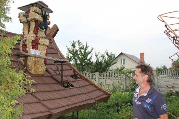Теперь жилище Бабы-яги не только надежно укрыто от дождей и снега, но может вращаться. Достаточно дать известный даже детям приказ: «Стань к лесу задом – ко мне передом!» По трубе лезет забавный кот, вцепившийся в кирпич. Очевидно, все-таки когда-нибудь долезет.