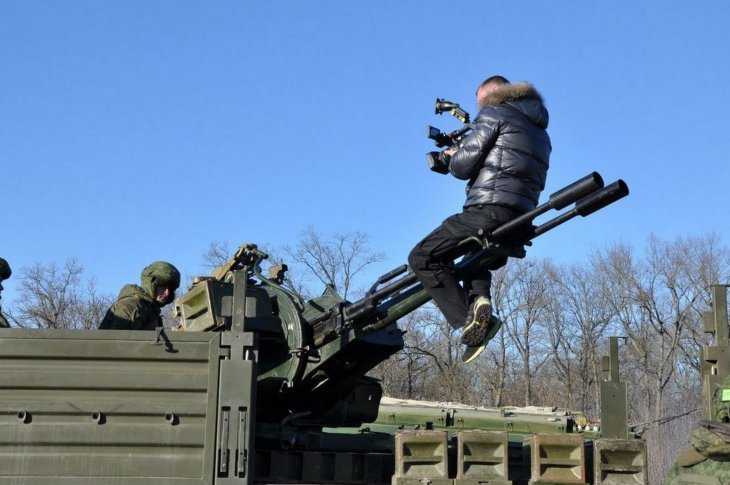 Фотография, размещенная Константином, сопровождается такими словами об Александре Суранове: «Запись стендапа. Под Краснодаром 9.02.2015. Герой – Саша С., который на зенитном орудии с камерой. Хотя бойцы Майкопской бригады там были не меньшие герои. Внезапная проверка боеготовности. Оператор − Александр Суранов».