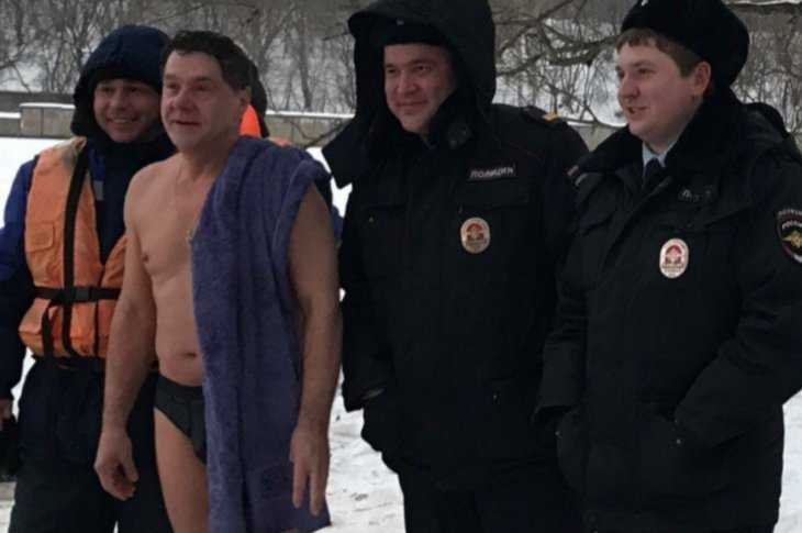 Надо отметить, что столичная купель, куда пришел актер, выглядит совсем сиротски по сравнению с брянскими, где рядом стоят палатки, где даже предлагают чай. Около московской полыньи переминались лишь спасатели и полицейские, а сама прорубь весьма неудобна для того, чтобы в нее окунуться – ни ступенек, ни тебе сосновых ветвей, чтобы не скользить. Куски фанеры на льду – вот и все «благоустройство». Однако Маковецкому это не помешало. Правда, одеваться пришлось на ветру, прикрывал актера от посторонних взоров его приятель.