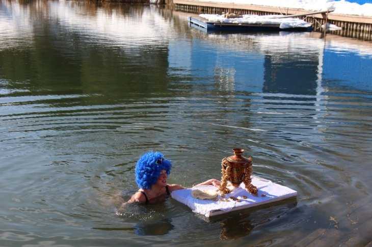 Зрелище этим не закончилось, потому что на водной глади решили учинить чаепитие. На большом подносе разместили самовар с сушками и блинами, пустив его в свободное плаванье. Правда, пили чай потом на берегу, так как на подносе не оказалось чашек. Угощение было бесплатным для участников ледяного подвига.