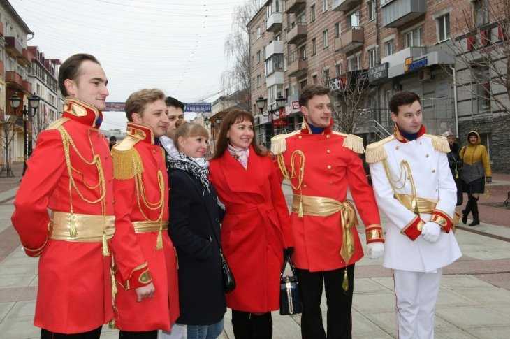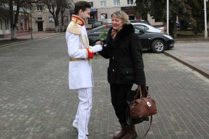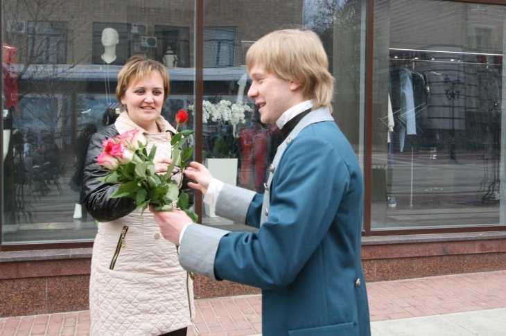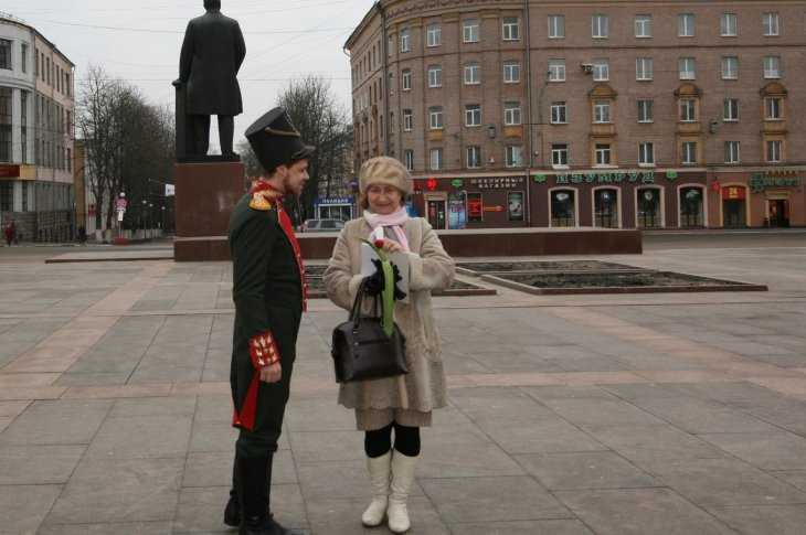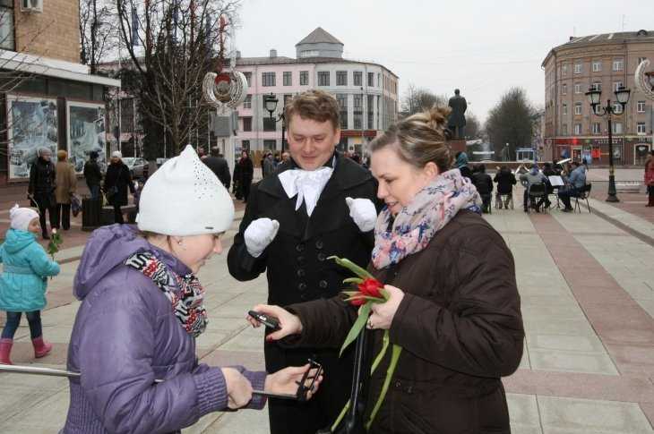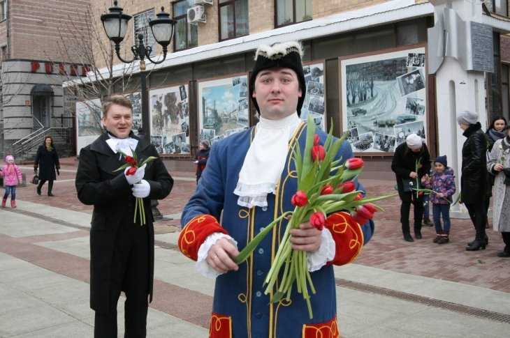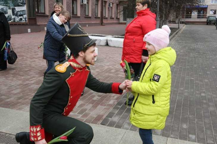 В Брянске бульвар Гагарина ближе к полудню превратился в сцену под открытым небом. Поздравление приготовили для женщин музыканты духового оркестра. А галантные кавалеры в форме офицеров разных эпох вышли встречать девушек с цветами, улыбками и шутками.