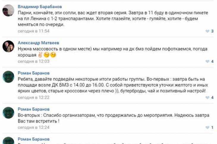 В администрации города предупредили, что все пикеты 26 марта будут считаться незаконными. Однако «навальнюк» Владимир Барабанов заявил в сети, что все равно выйдет на площадь Ленина. Его поддержали несколько человек. Впрочем, в их адрес тоже полетели обвинения. Сами «навальнюки» несколько сменили тактику: «Мы считаем, что в нашем демократическом обществе каждый должен нести ответственность за свои поступки сам. Организаторы и уполномоченные снимают с себя ответственность, хотя бы потому, что массовый пикет несогласованный. Тем не менее выйти на прогулку мы никому не можем запретить. Мы никого ни к чему не призываем!»