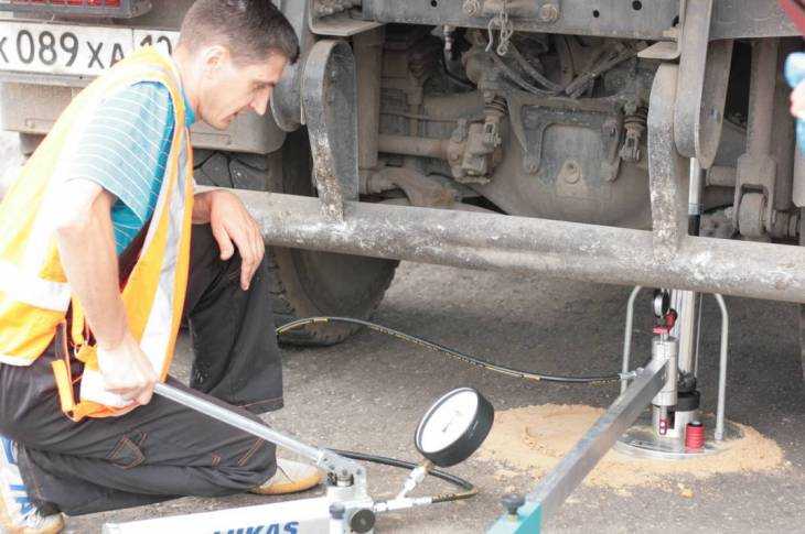 Следом за «американцем» идут специалисты управления дороги Москва – Бобруйск, которые перепроверяют замеры традиционным методом. Под заднюю ось грузовика устанавливается прибор, похожий на домкрат, и с помощью этого отечественного прогибомера получают детализированные данные. Они позволяют выявить погрешности и устранить их.