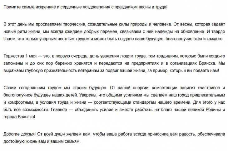 Руководители Брянска пожелали землякам, чтобы «работа всегда приносила вам радость, обеспечивала достойную жизнь вам и вашим семьям».