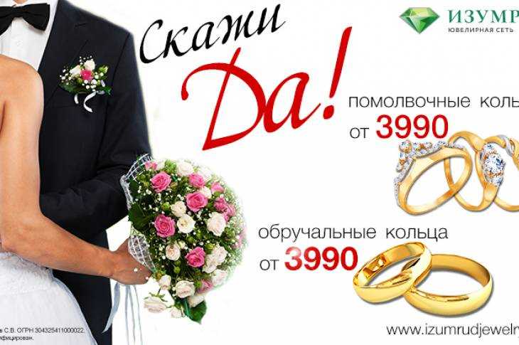 Также специально для молодоженов мы приготовили сюрприз − во всех магазинах «Изумруд» выгодная цена 3 990 рублей на обручальные кольца, а также подарочный сертификат при покупке помолвочного кольца!