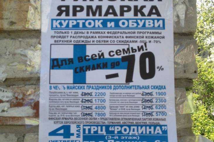 Как гласит листовка, 4 мая в ТРЦ «Родина» проходит «финская ярмарка курток и обуви». Организаторы обещают скидки на конфискат в честь праздников.