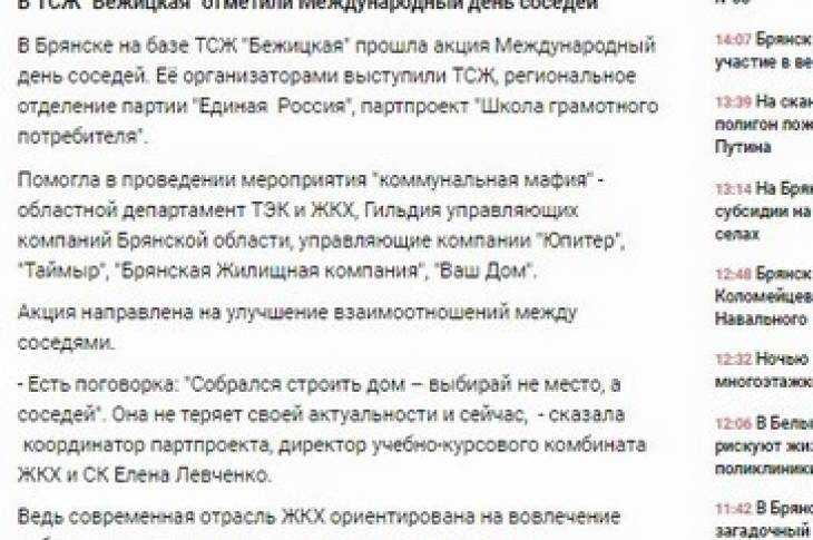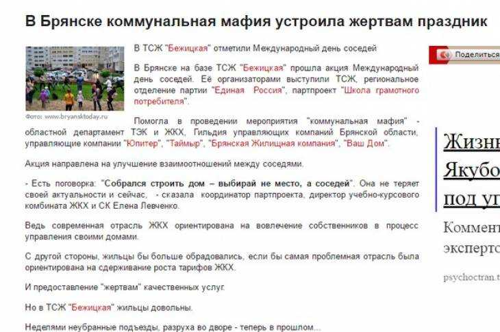 В основе заметки – статья пресс-службы партии, которая рассказала о «Дне соседей», прошедшем во дворе четвертого корпуса дома 1 на Бежицкой улице. Праздник получился великолепным, именно так его оценили сами жильцы, в том числе многочисленная детвора. Тем не менее сайт написал, что «в проведении мероприятия» помогла «коммунальная мафия» – областной департамент ТЭК и ЖКХ, управляющие компании, в том числе товарищество собственников жилья, которое и обслуживает дом на Бежицкой. Многозначительный вывод автора публикации привел в недоумение жильцов дома и сотрудников ТСЖ «Бежицкая»: «Неделями неубранные подъезды, разруха во дворе – теперь в прошлом».
