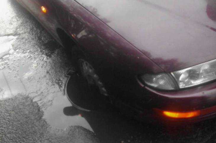 Правое переднее колесо полностью провалилось в открытый люк, и машина села на порог. Этот участок дороги находится в разбитом состоянии. Автомобилисты посоветовали водителю иномарки обратиться в суд и возместить стоимость ремонта.