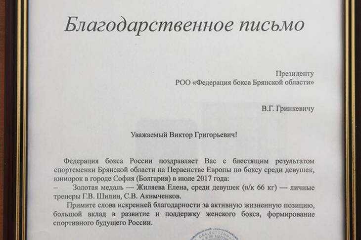 Виктор Гринкевич постоянно оказывает финансовую поддержку спортсменам Брянской федерации бокса. На днях в его адрес поступила благодарность от имени генерального секретаря федерации бокса России Омара Кремлёва за финансовое участие в подготовке и участии воспитанницы ДЮСШ «Олимп» Елены Жиляевой в первенстве Европы по боксу среди девушек. Брянская спортсменка на этом турнире завоевала золотую медаль.