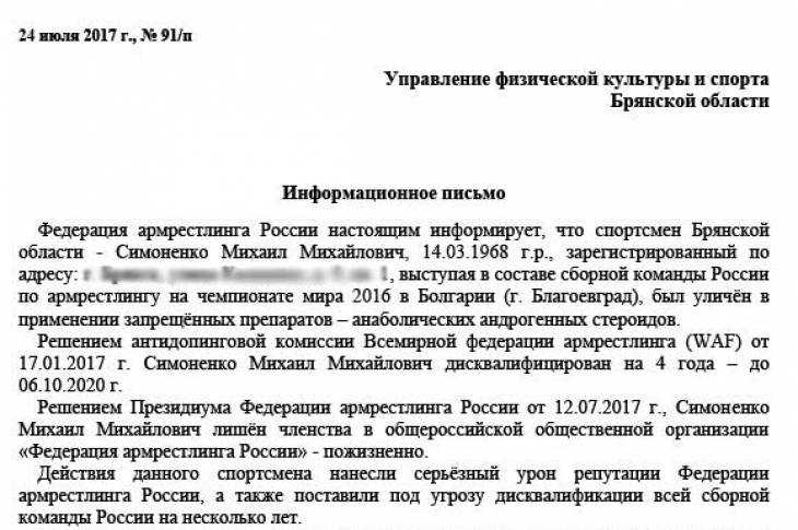 В письме, которое направлено руководителям Брянска и управлению физкультуры и спорта, сказано, что действия Симоненко нанесли серьезный урон федерации.