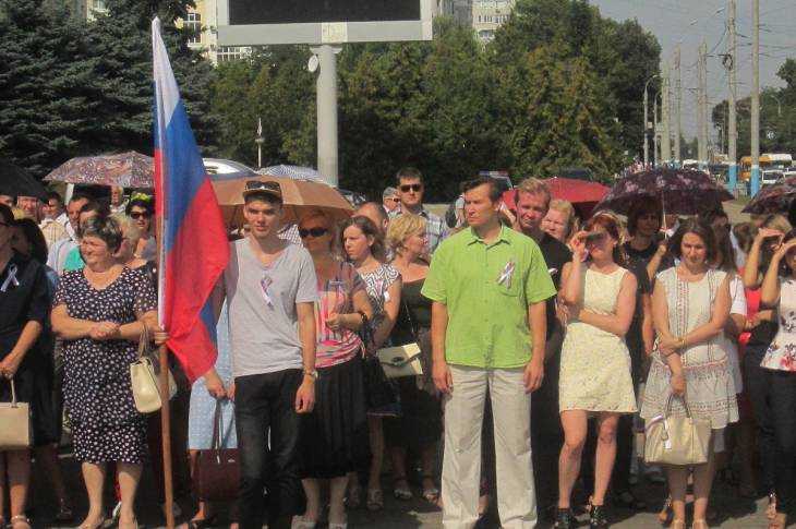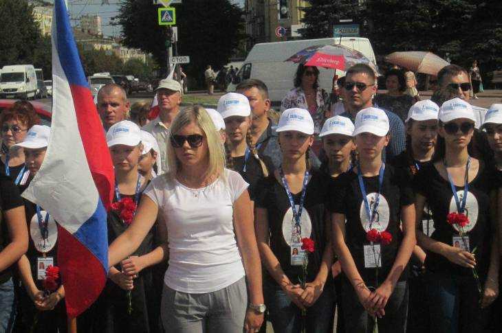 Юные патриоты развернули на площади огромное полотнише российского флага, а затем участники акции вместе с Центральным военным оркестром Министерства обороны России исполнили гимн страны.