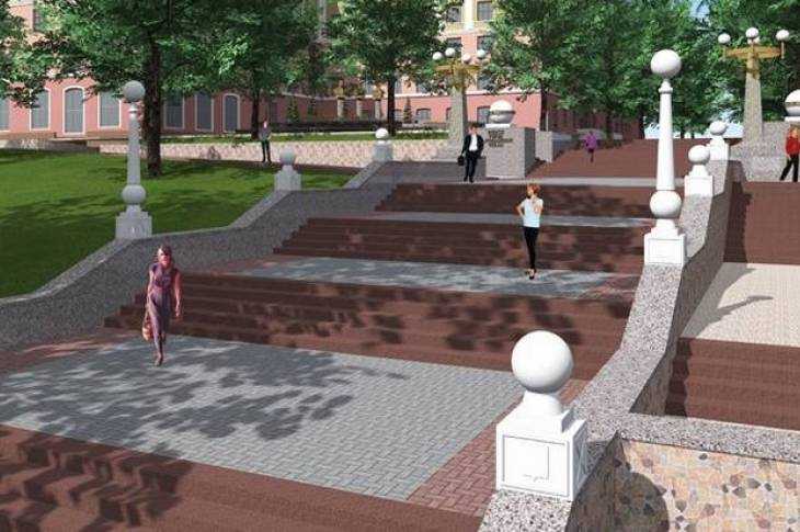 Оно представляет собой кольцо на «подсвечнике», стреляющее в небо штырями. Горожане ломают головы над тем, что бы это значило. Для разгадки следует заглянуть в эскизы проектов реконструкции. Точнее, можно ограничиться проектом Александра Панченко, который власти города и выбрали. Панченко предложил круглые светильники наподобие послевоенных и пилоны с датой основания города. На эскизе автора изображена та конструкция, которая установлена на лестнице. Не хватает только шаров – любимого элемента не только Панченко, но и городских начальников, включая Сергея Смирнова с его гранитным шаром у стадиона.
