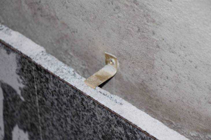 Оказывается, в торце плитки болгаркой прорезается узкая щель, куда вставляют под прямым углом крюк. Другой конец крюка крепится к стене.