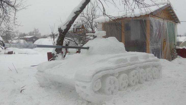 Пригородный брянский поселок Белые Берега обзавелся белым танком. Его создал из снега местный житель.