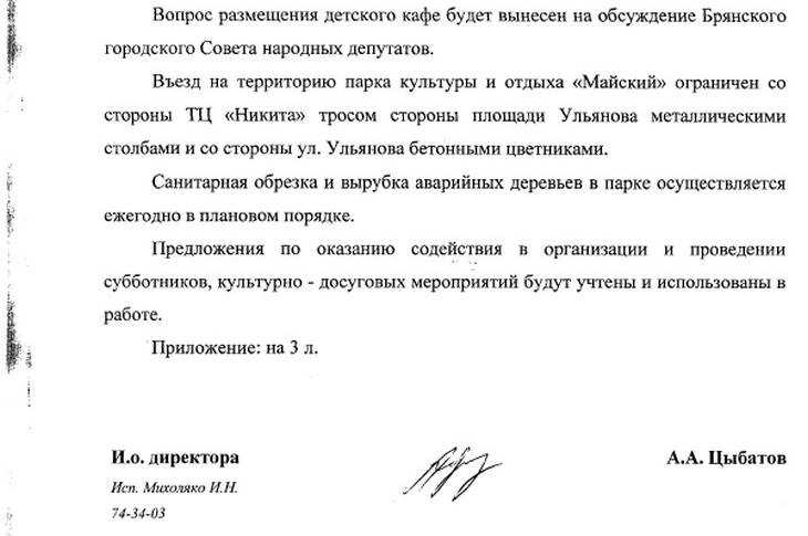 В распоряжении «Брянских новостей» оказался ответ и.о. директора городского объединения парков Артема Цыбатова. Он утверждает, что со всех сторон парка для автомобилистов созданы преграды, а со стороны ТРЦ «Никита» висит некий трос. Однако обнаружить этот трос ни горожанам, ни корреспонденту «Брянских новостей» не удалось, а проезд для машин более чем свободен, и этим пользуются.