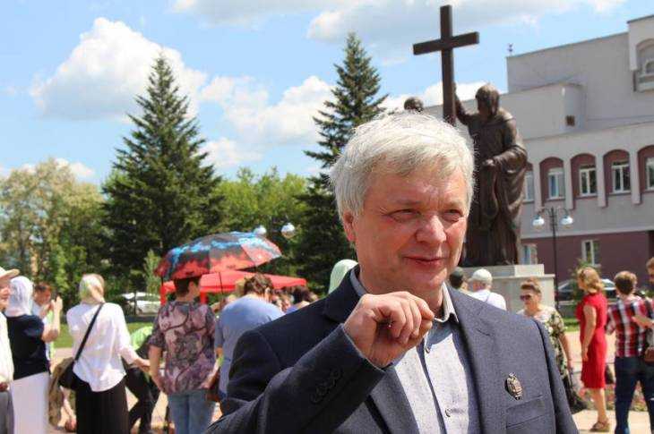Памятник отрыли после Крестного хода к Славянской площади. Обратил ли кто-то внимание, что святой даже не прикасается к кресту? Почему? Александр Ромашевский изложил свое понимание «Брянским новостям»: