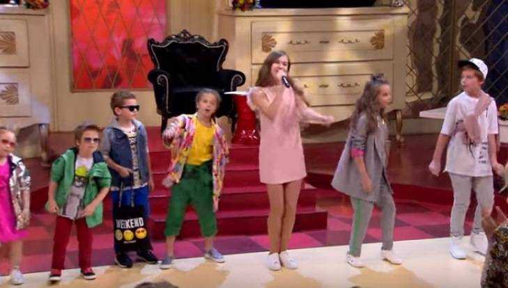 Финалистка телепроекта «Голос» исполнила известную песню «Вместе весело шагать по просторам», под которую маленькие модники прошлись по импровизированному подиуму (на видео − с 18.03)