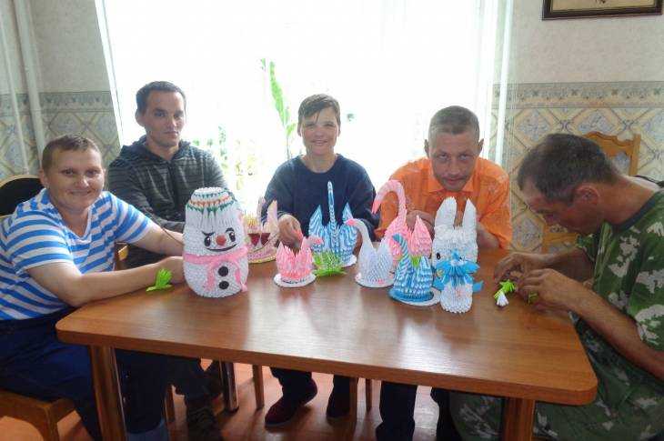 Белов И., Кузнецов С., Богданова Н. принялись за новую работу – поделки из бумаги (оригами). В их руках самая обычная бумага оживает, превращается в дивных птиц, животных. А разве не удивительно, что маленький бумажных треугольник, из которого получаются различные фигурки, таит в себе фантастические возможности. Подопечные увлечены техникой модульного оригами и не собираются останавливаться на достигнутом. Своими творческими работами получатели социальных услуг оказывают неоценимую помощь в оформлении стендов о жизни интерната.