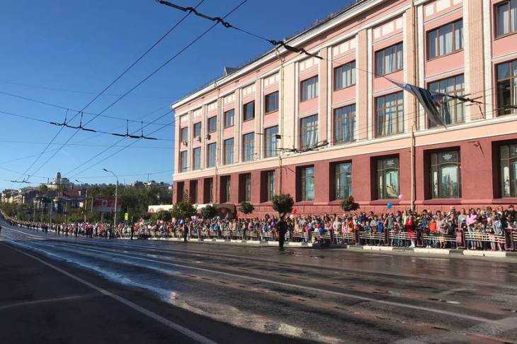 На главных площадях города и вдоль проспекта Ленина выстроились десятки тысяч горожан и гостей Брянска. Волнуются даже военнослужащие, которые стоят строгими шеренгами. В руках у многих горожан шары и флаги, всюду слышны детские голоса.