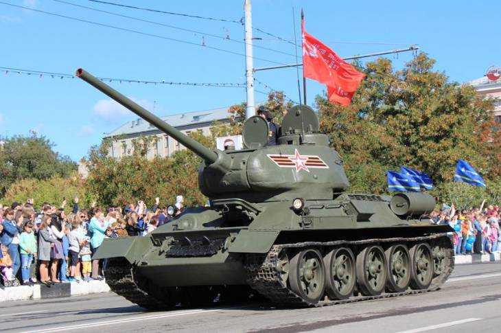 По проспекту прошли танки Т-72Б3, БМП-2, бронетранспортеры, системы «Торнадо-Г», установки «Мста-СМ2». Самой почетной машиной, был, разумеется, танк Победы – легендарный Т-34.