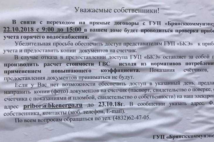 Жителей области известили о том, что представители ГУП «Брянсккоммунэнерго» будут проверять в квартирах счетчики и документы на них. Приказывают быть дома в рабочее время и открывать двери незваным гостям. В том случае, если контролеры не смогут зайти в квартиру, ее владельцу будут начислять не установленный властью тариф, а гораздо большую сумму. Для этого пригрозили использовать «повышающий коэффициент».