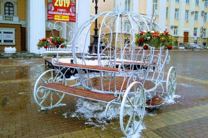 В таком же стиле украсили и стоявшую на площади карету. Покрытая еловыми кашпо она в темное время суток подсвечивается синими лампочками.