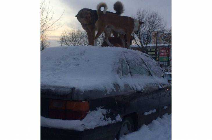 Житель Брянска сфотографировал на Новостройке забавную уличную сцену. На крышу стоявшего во дворе автомобиля «Ауди» забрались погреться несколько бродячих собак.