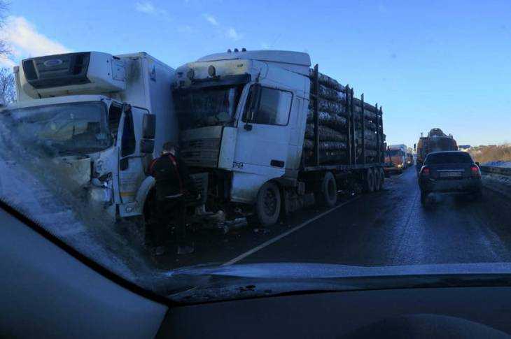 На объездной дороге вокруг Брянска произошло ДТП с участием двух грузовиков с полуприцепами. Лесовоз сбоку въехал в рефрижератор. На мосту образовалась пробка.